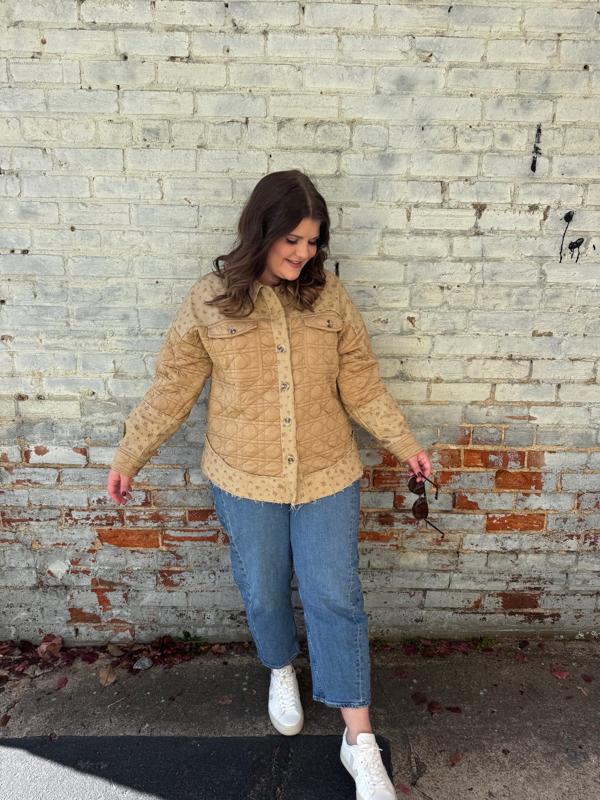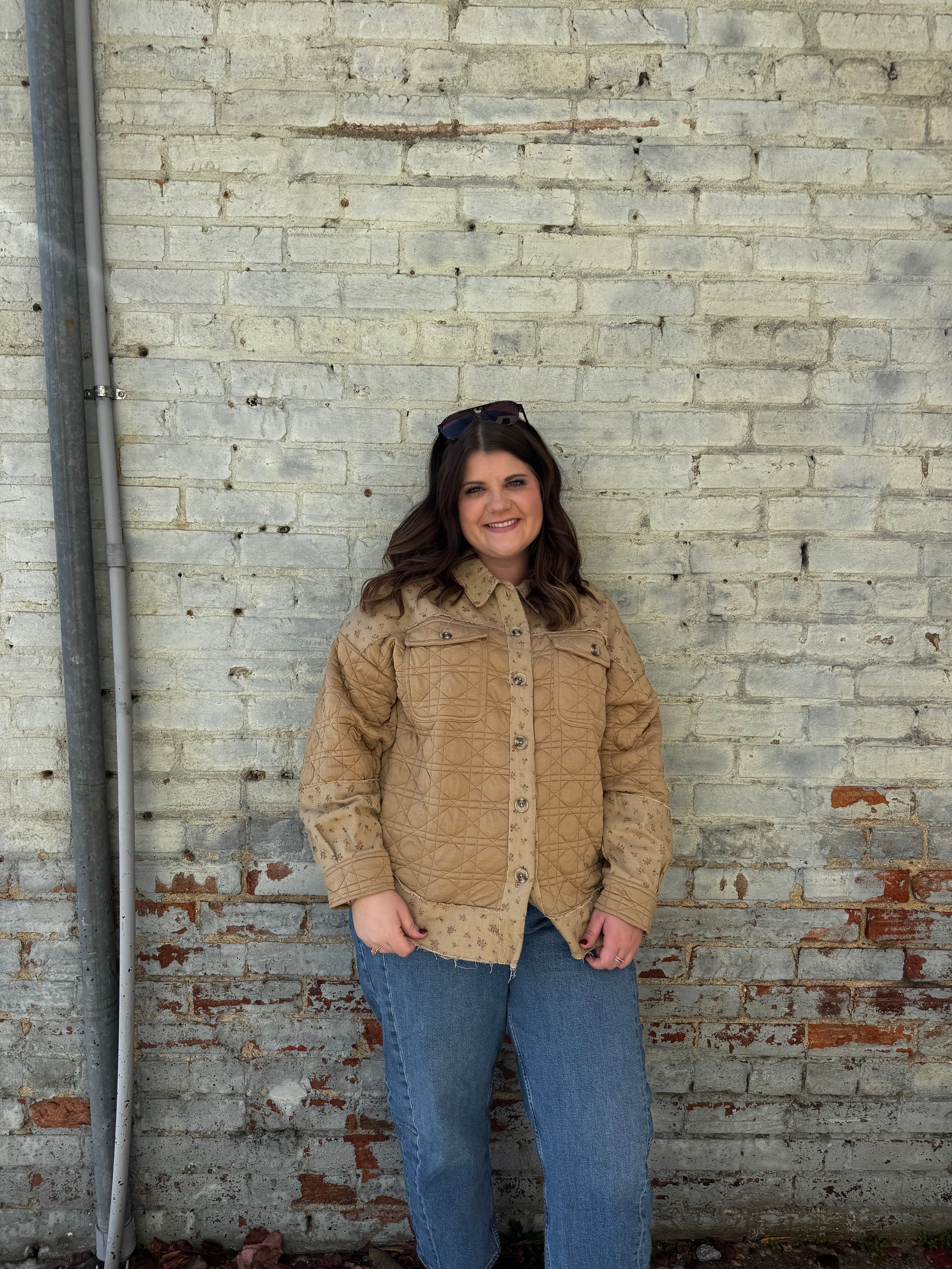 Oversized floral contrast cotton button down jacket with multi-textured fabric. Haley is wearing a size large.