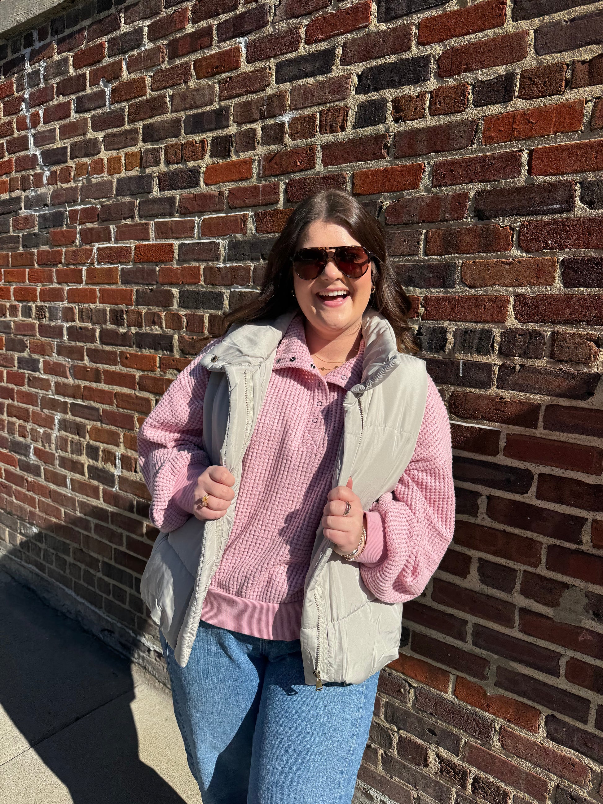 Cement colored high neck zip up puffer vest, 100% Polyester. Haley is wearing the size large. Pairs well with our Hannah Waffle Knit pullover