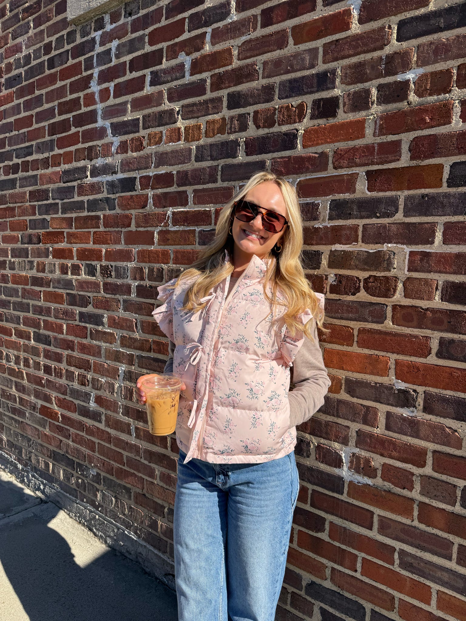 Pink floral ruffle detail puffer vest with mock neck detail. Millie is wearing a size small.