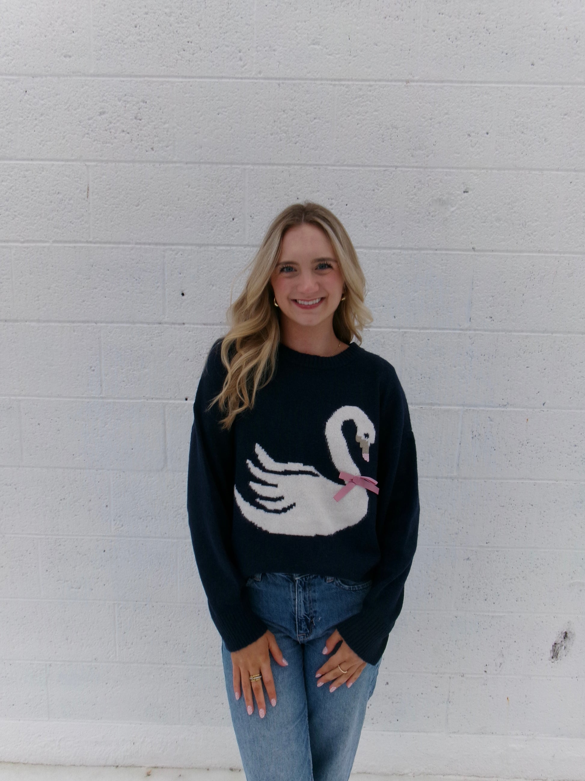 A cozy knit sweater featuring a playful swan graphic on a classic dark base. Soft, comfortable, and easy to style with denim for an effortlessly cute look. 🦢✨. Millie is wearing a size small.