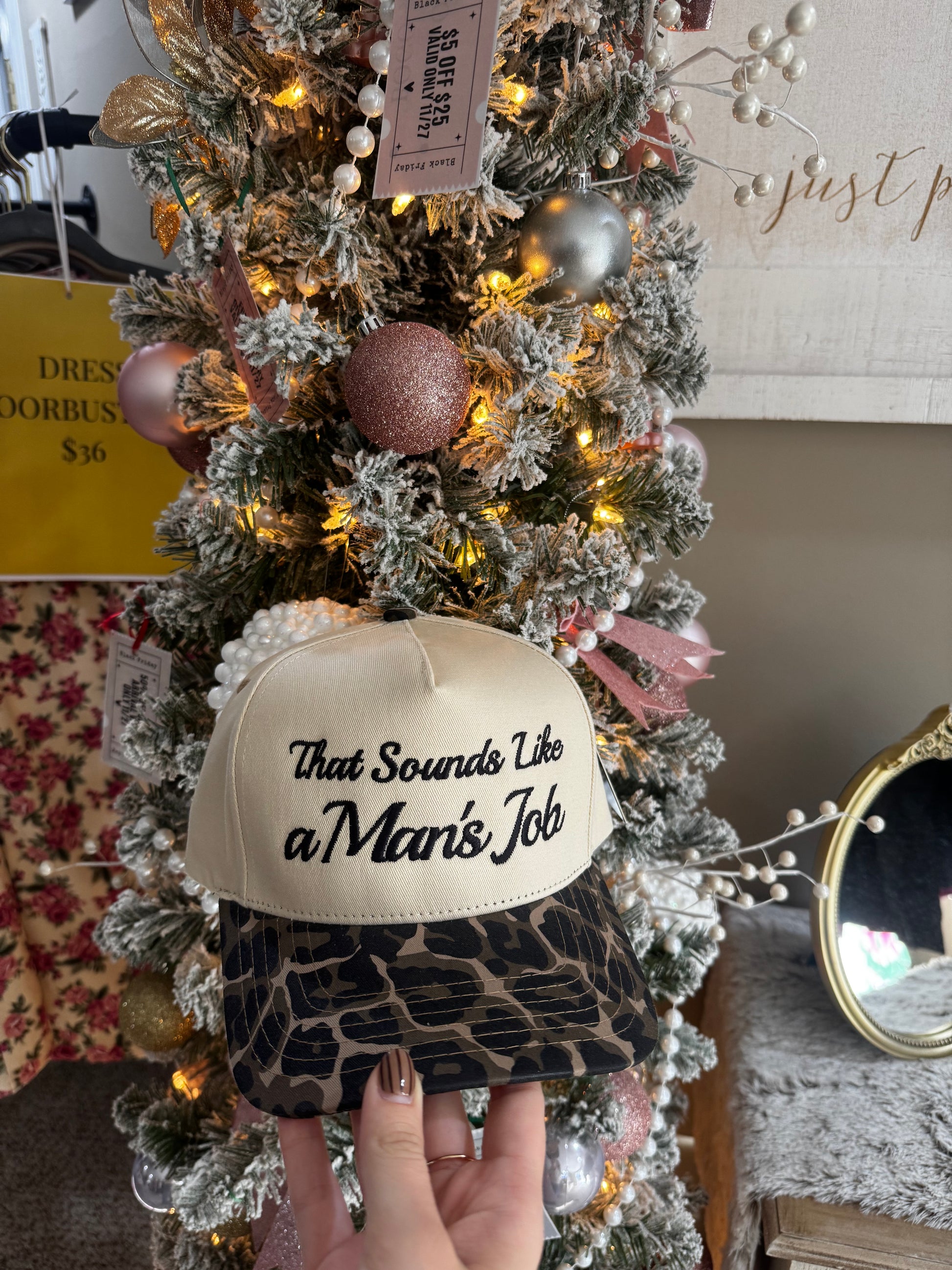 Cheetah and cream trucker hat. "that sounds like a mans job".