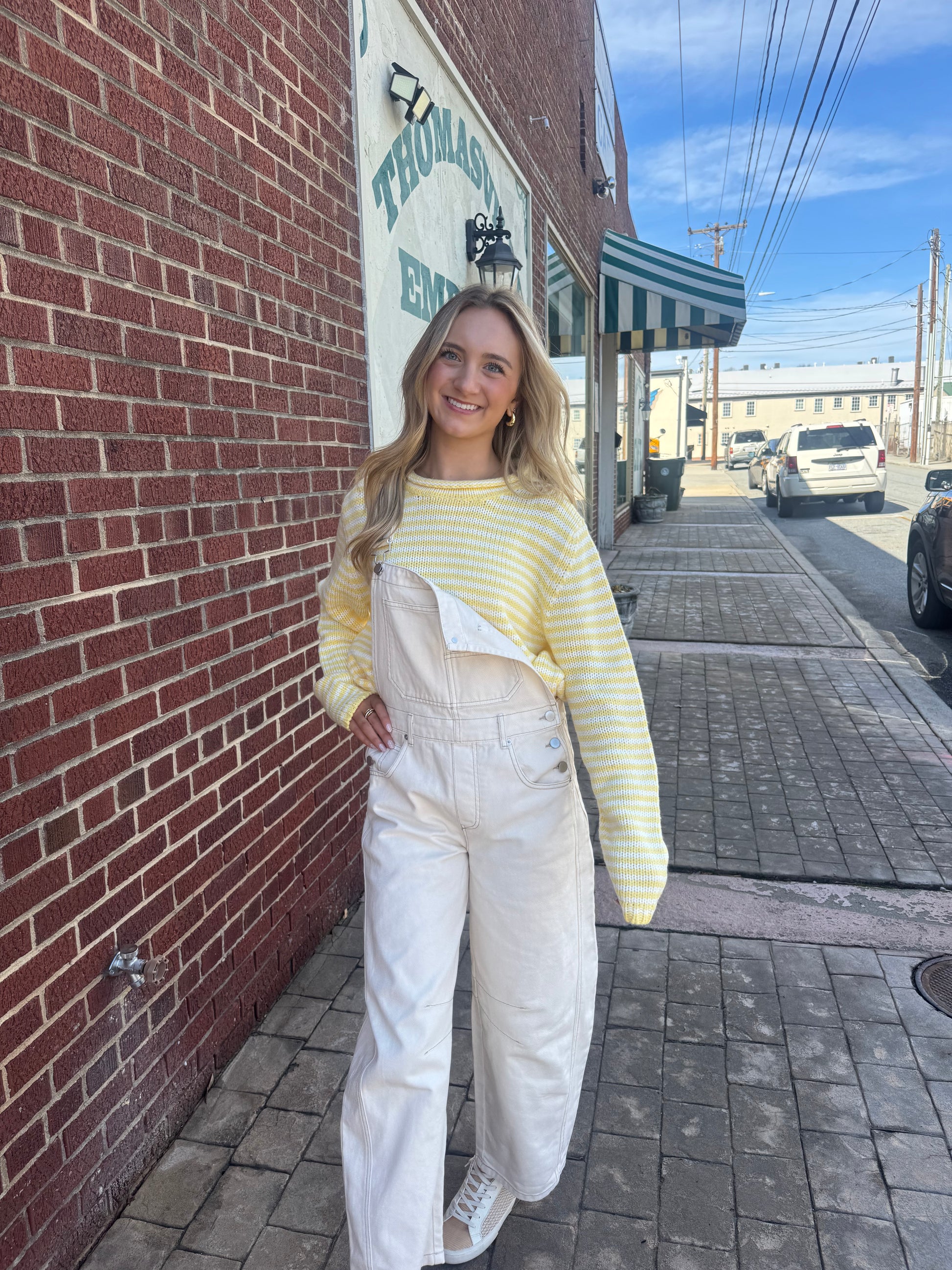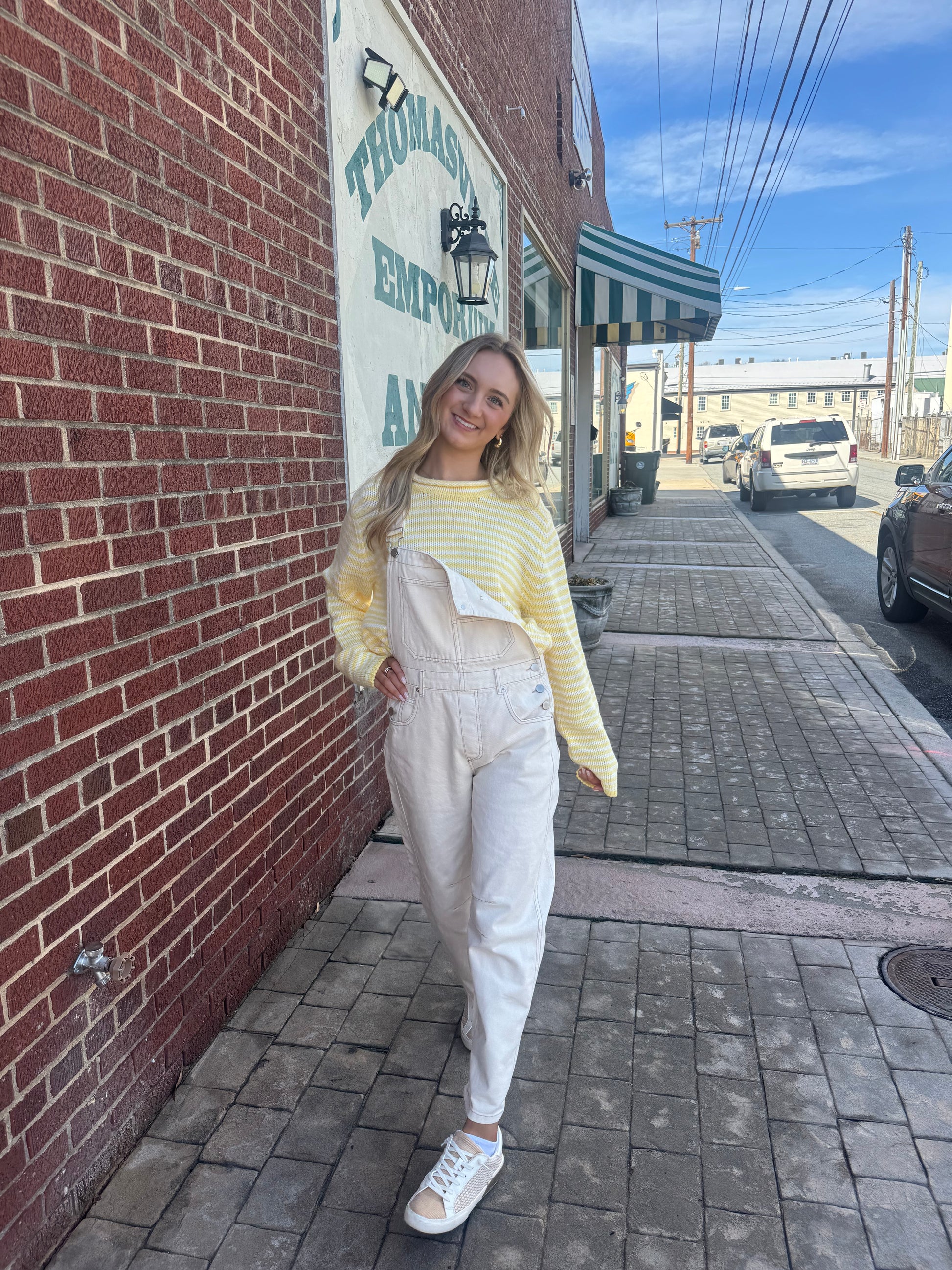 The Modern Muse Overalls are a fresh, contemporary take on a timeless workwear staple. These overalls offer a clean and polished aesthetic in a versatile ivory denim with a barrel cut that brightens up any seasonal wardrobe. Millie is wearing a size small and has it paired with our lemon meringue sweater.