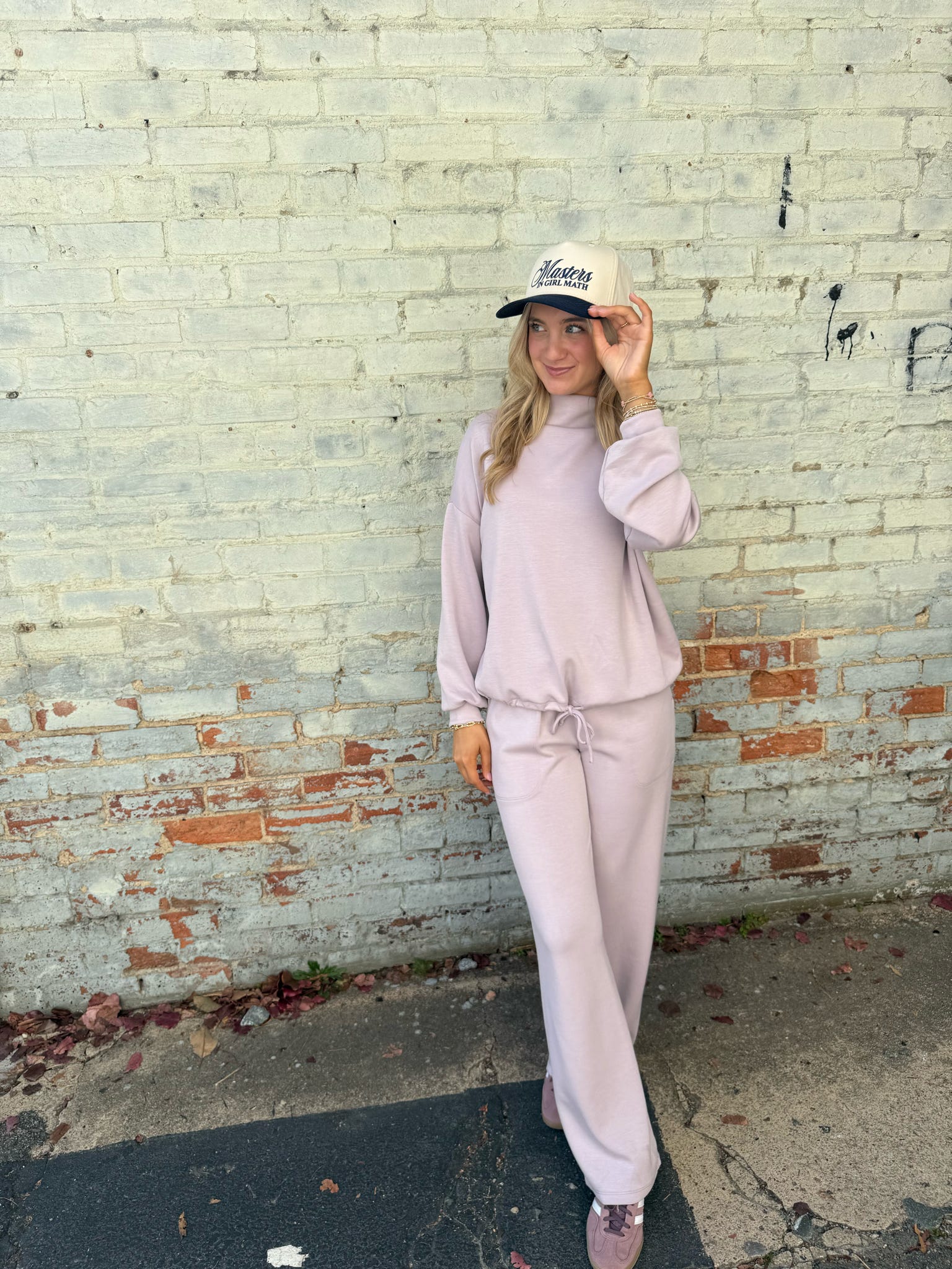 Liliac mock neck long sleeve waist tie sweat set. Millie is wearing the size small. Paired with our "masters in girl math" trucker hat.