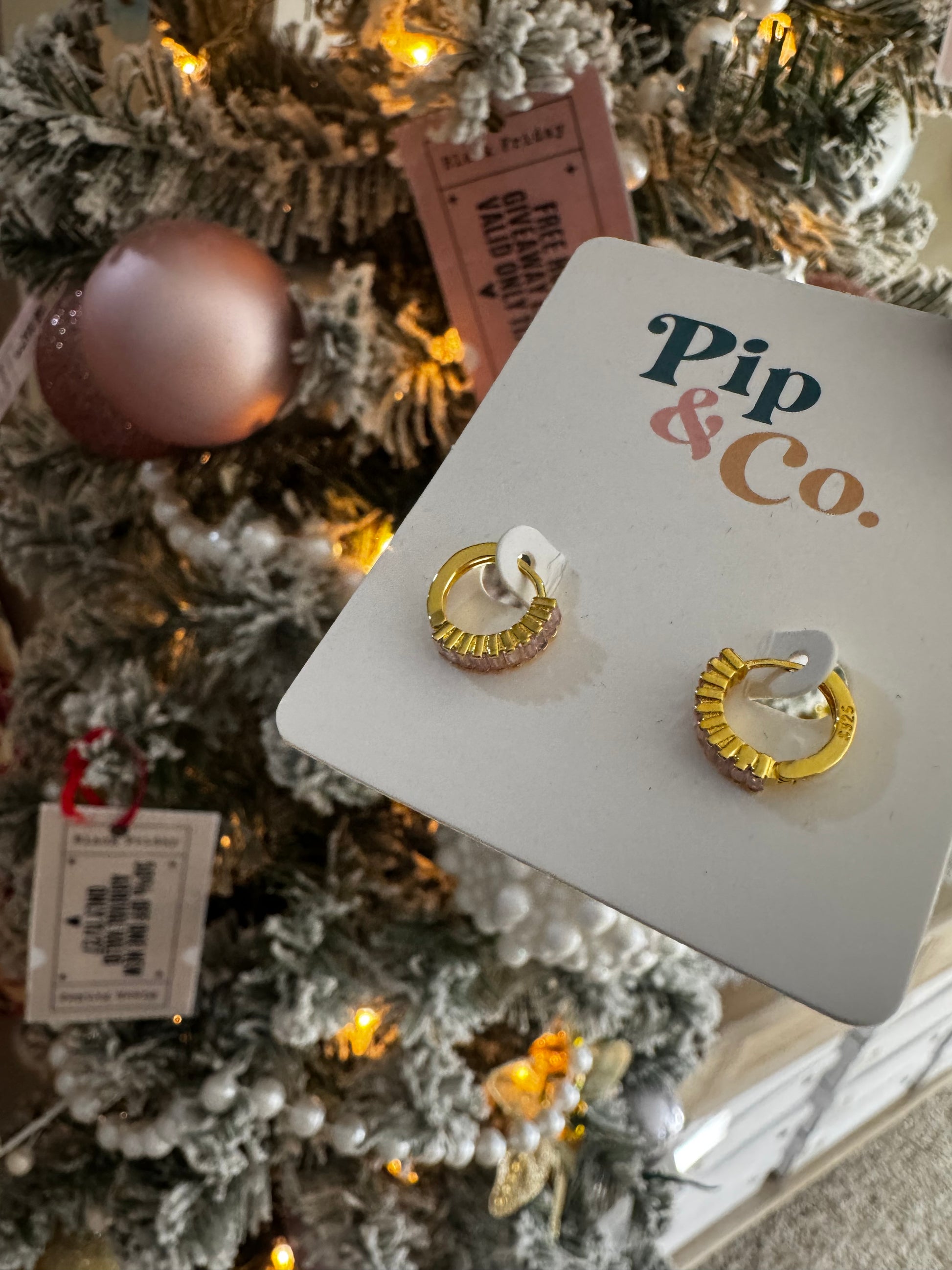 Sterling Silver, 18k Gold Plated Huggie, coquette, earring, hoop, gold plated with pink details.