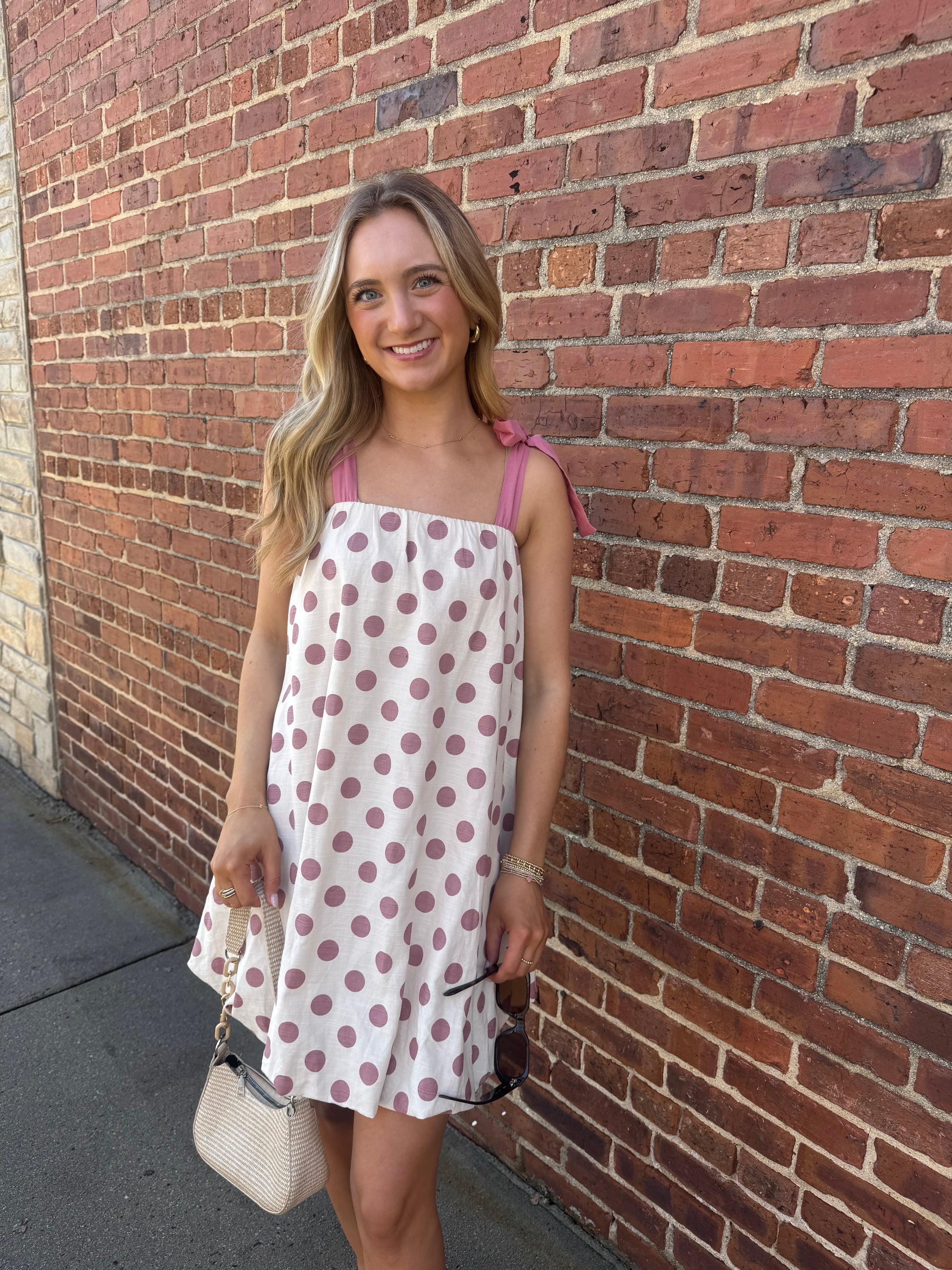 The Spot On Mini Dress is a playful and breezy addition to your warm-weather rotation, perfect for everything from brunch dates to summer strolls. This piece features an ivory base with bold, dusty rose polka dots for a classic yet fresh aesthetic. Millie is wearing the size small