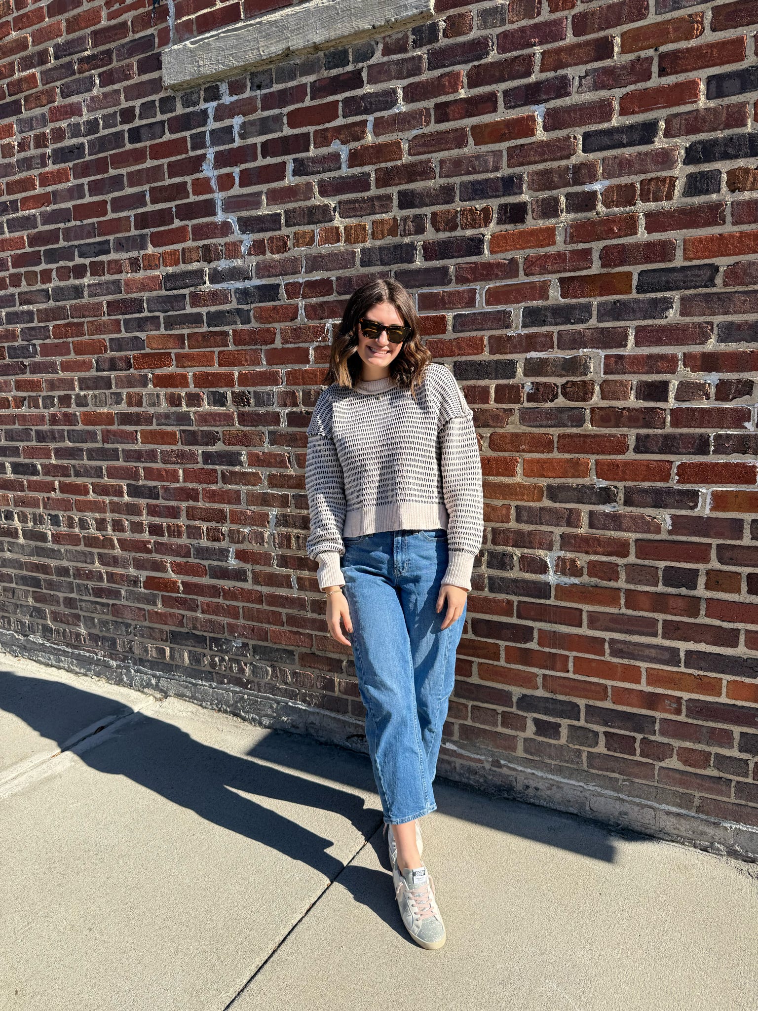 Oversized two-toned textured knit sweater with slide slit detail. Mackenzie is wearing a size small.